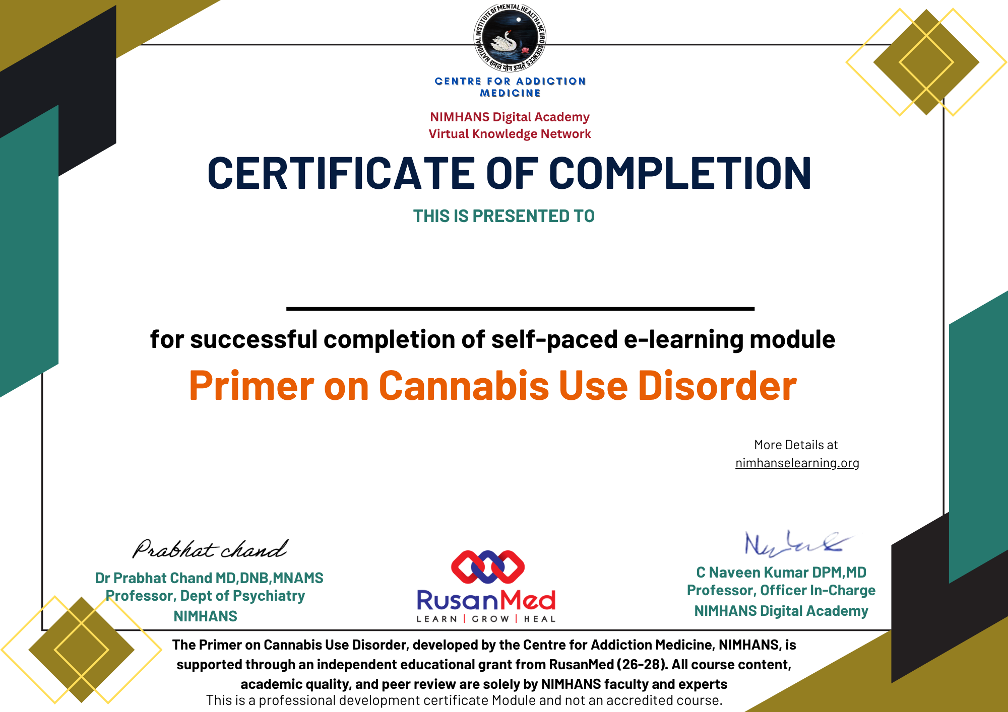 | FAQs | 1. Recognition status: This is a professional development certification online module from the Centre for Addiction Medicine & NIMHANS Digital Academy and NOT an accredited Course. 2. Certificate of Completion: Completion of all Quiz (for lessons 1,2,3) with score >80%. One can avail of three attempts to complete. You can download the “e-Certificate of Completion.” after successful completion |