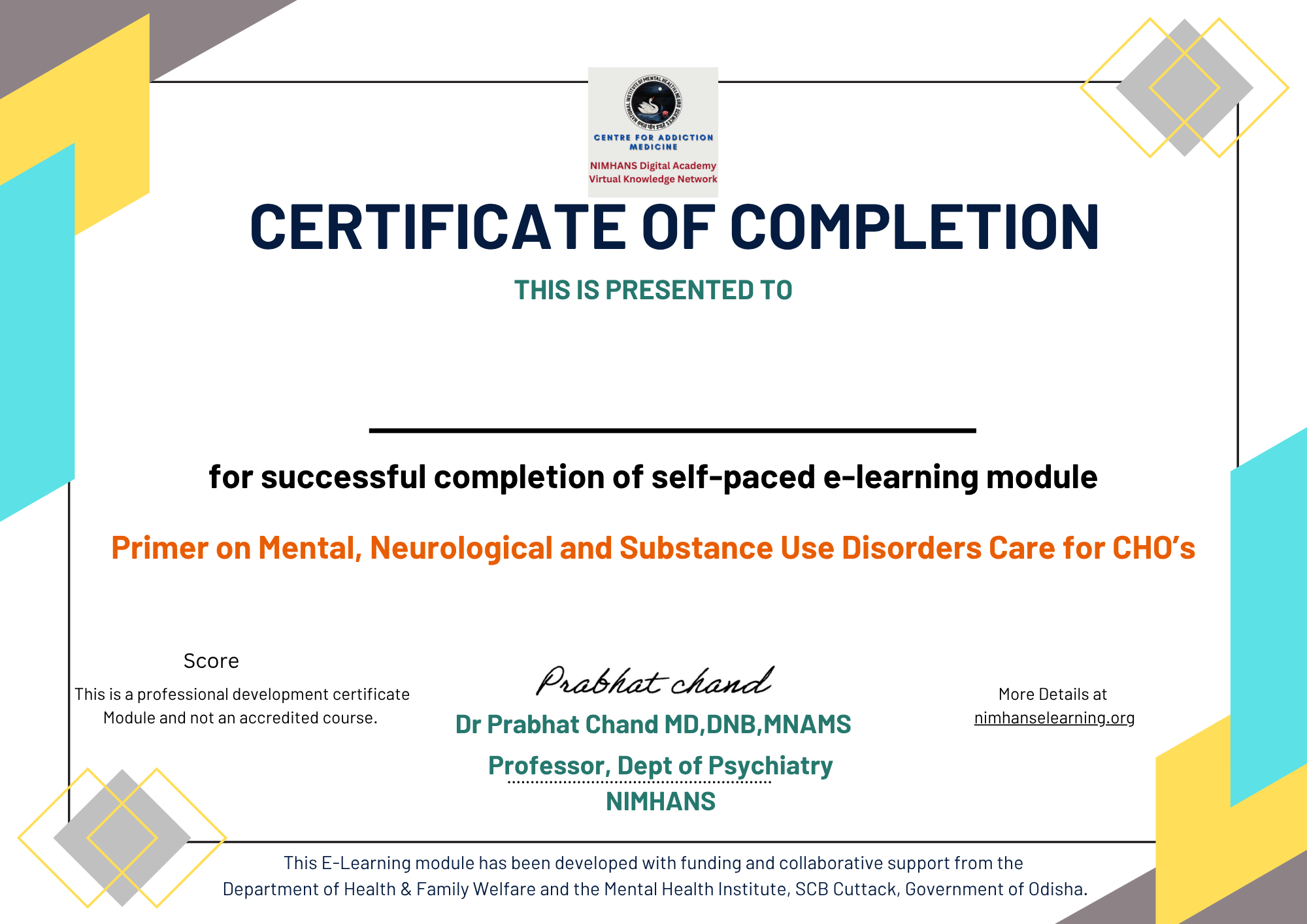 | Professional Development Certificate | A collaboration between NIMHANS and Mental Health Institute, Odisha Digital Academy for Mental Health, SCB Medical College, Cuttack, Dept of Health and Family Welfare, Govt of Odisha, |