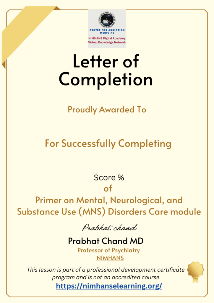 | FAQs | 1. Recognition status: This is a professional development certification online module from the Centre for Addiction Medicine & NIMHANS Digital Academy and NOT an accredited Course. 2. Certificate of Completion for the Whole MNS module: Complete all quizzes (for all lessons) with a score of ≥80%. Three attempts are available for each quiz. Download the “e-Certificate of Completion” after successfully completing all requirements 3. Letter for Completion of Each Lesson: Complete the respective lesson quiz with a score of ≥80%. Three attempts are available. Download the “Letter of Completion” after successfully passing each quiz. |