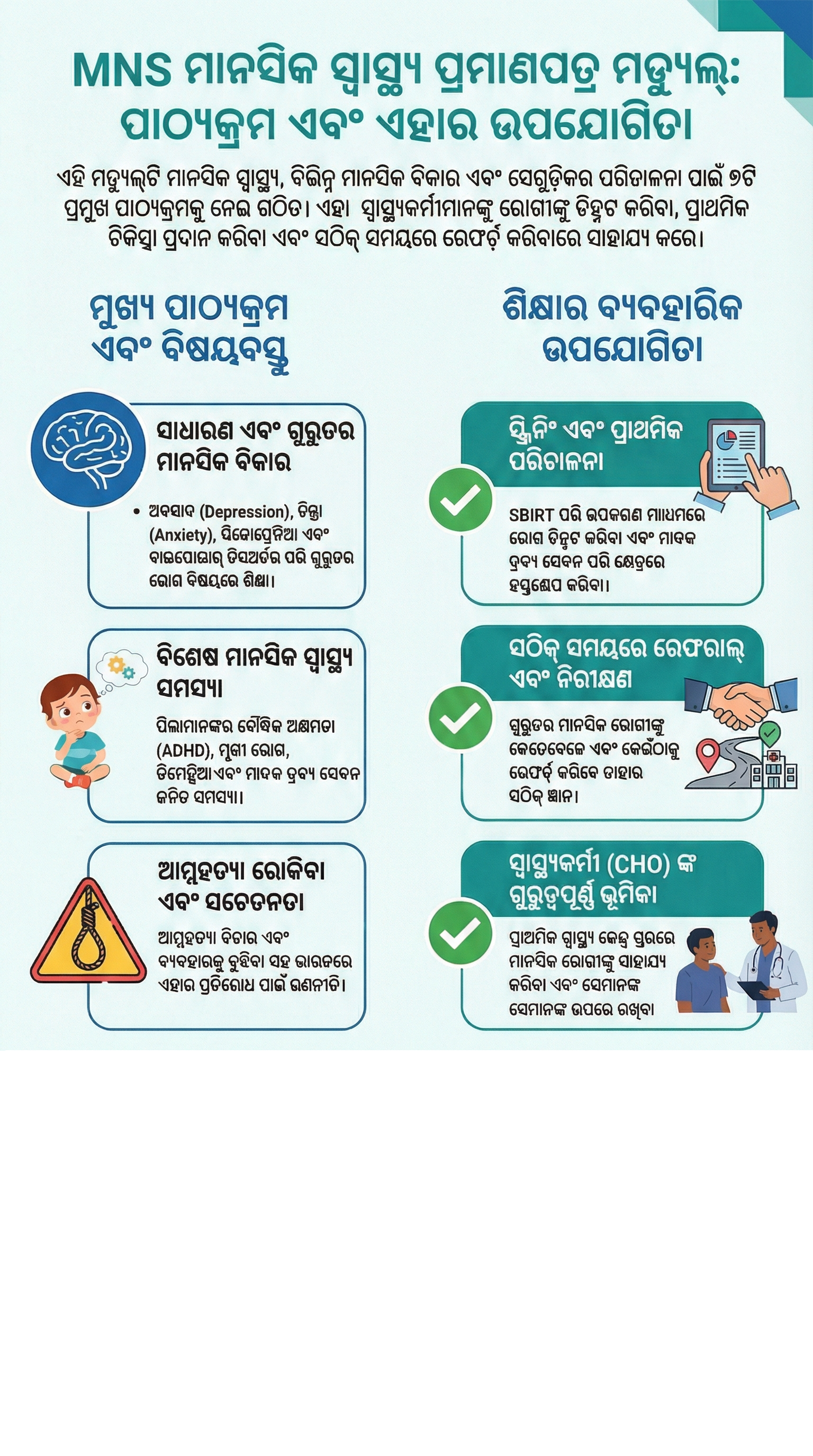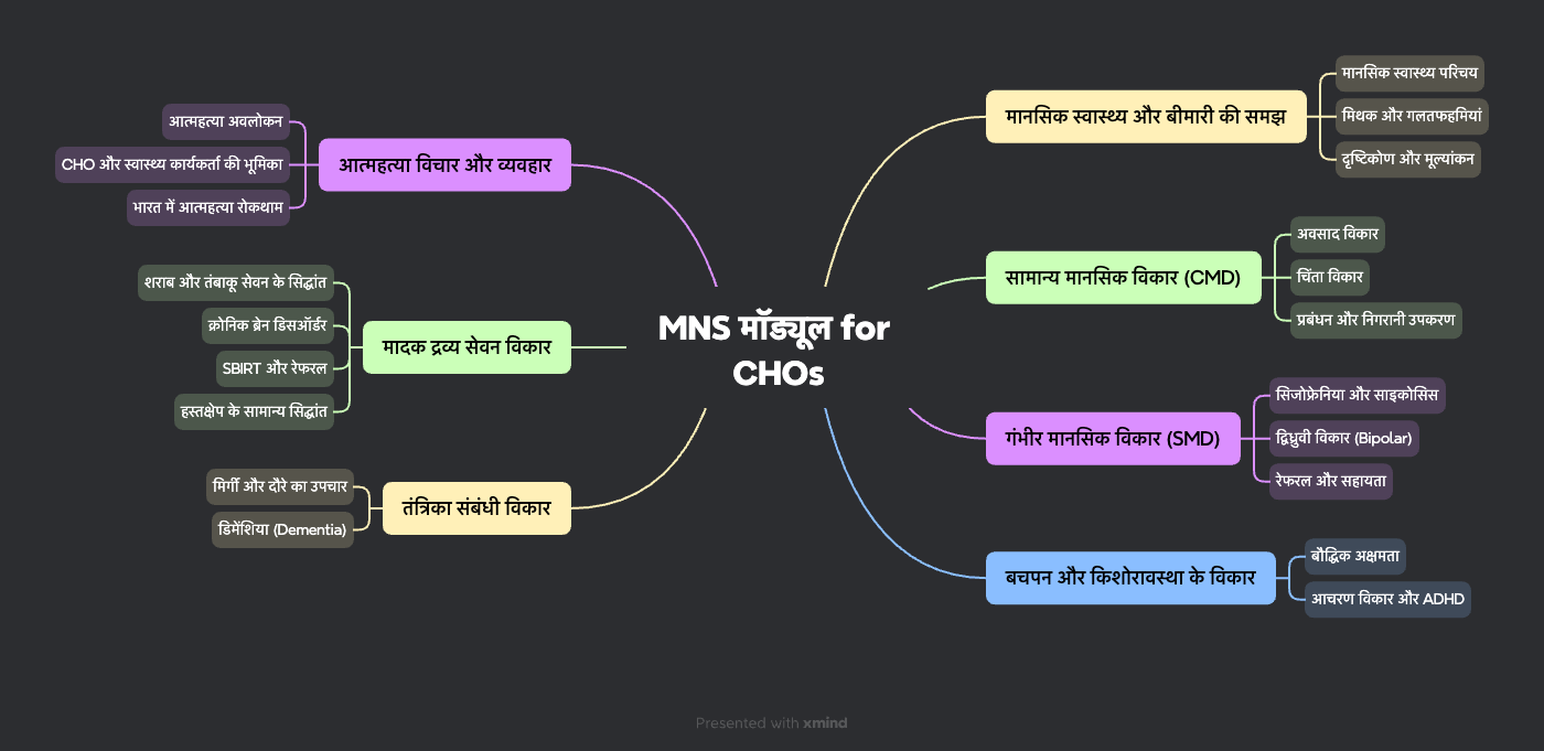 While this module was originally developed for CHOs (Community Health Officers) under Ayushman Arogya Mandir AAM’s 12th component (Screening and Basic Management of Mental Health Ailment), the foundational knowledge and skills are equally valuable for health-care providers working in clinical and community settings, who encounter mental health and substance use issues in their practice